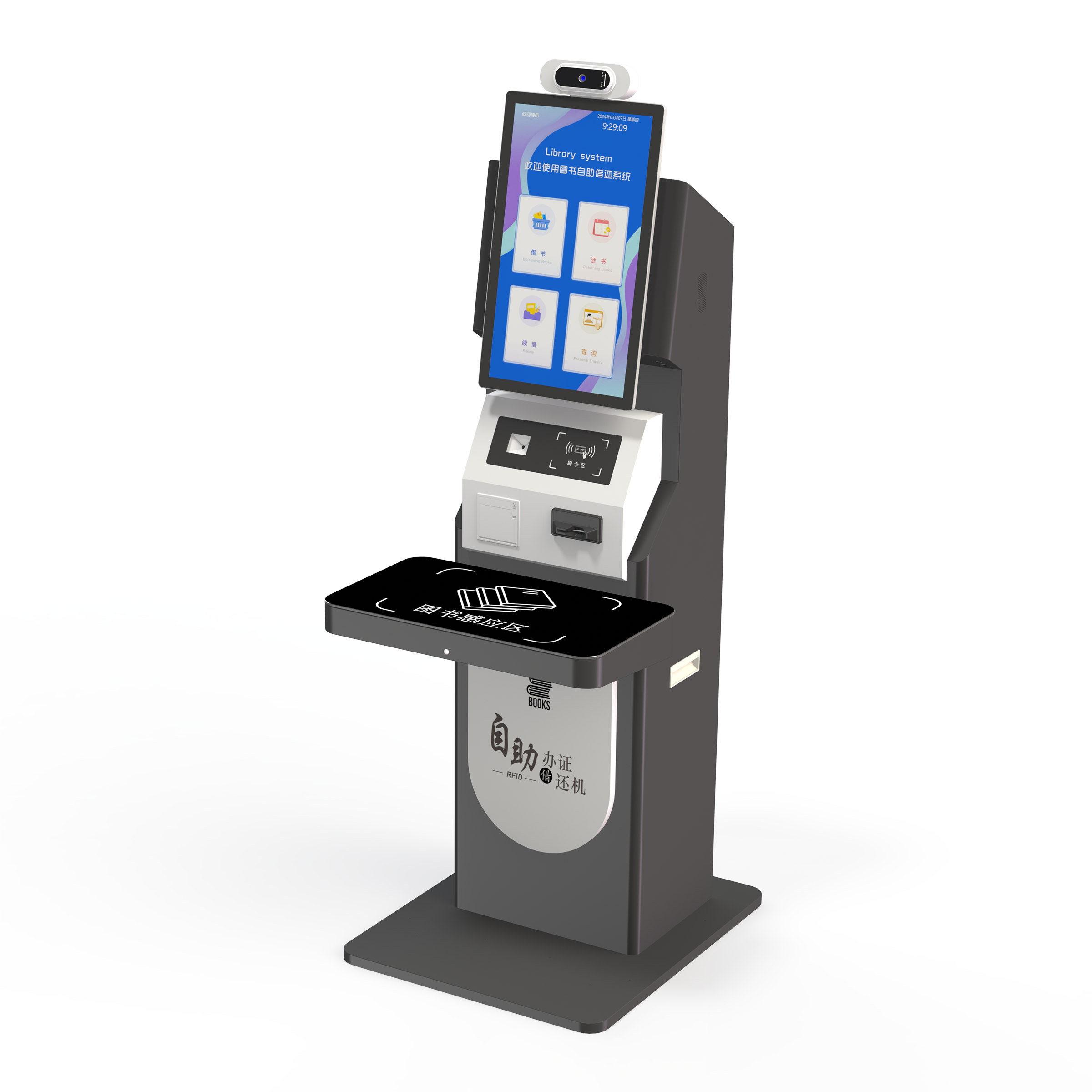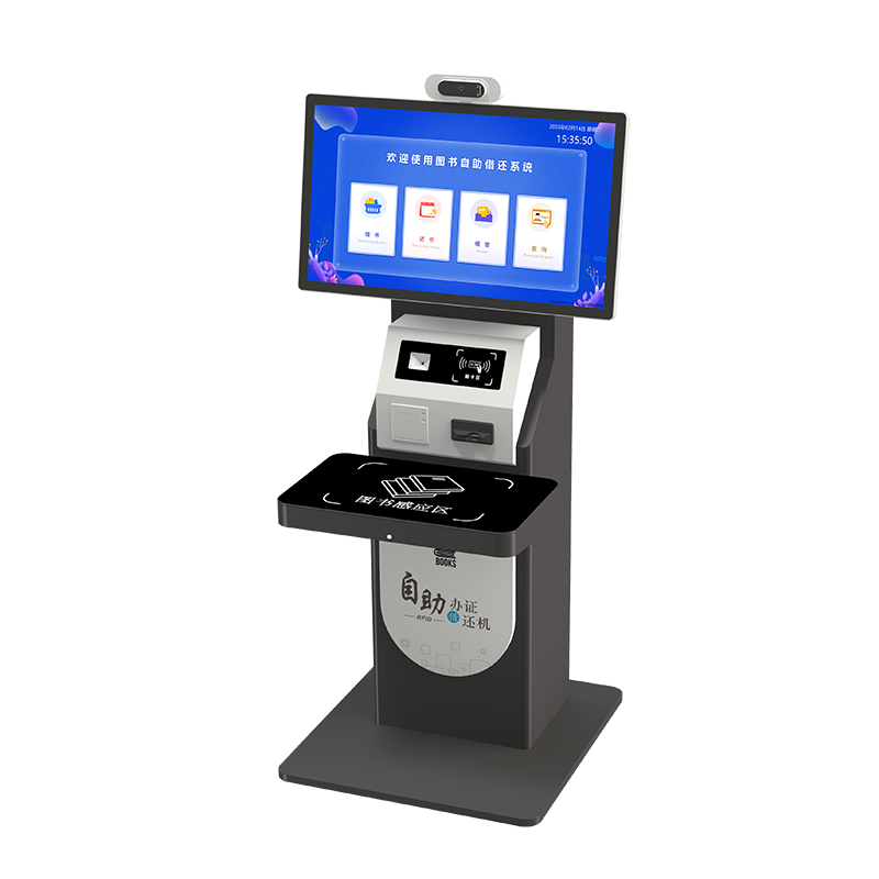 DJHJ43自助办证借还一体机,可感应识别粘贴有RFID标签的图书、并操作借还处理、也能让读者自助办理读者证的智能化设备。支持高频(HF)和超高频(UHF)两种频段。配备21.5寸/32寸或43寸触摸显示屏和简单操作的人机交流界面、图形界面,可选人脸识别、身份证、二维码、微信、支付宝、读者证等多种身份验证。由读者自助借还馆内书籍资料;帮助图书馆在有限的人力资源条件下,增进图书流通速率、简化借还流程,便利读者快速准确的完成借还,进而提高图书馆从业人员工作效率及服务品质。本产品广泛应用于智慧图书馆、档案、物资管理等领域。