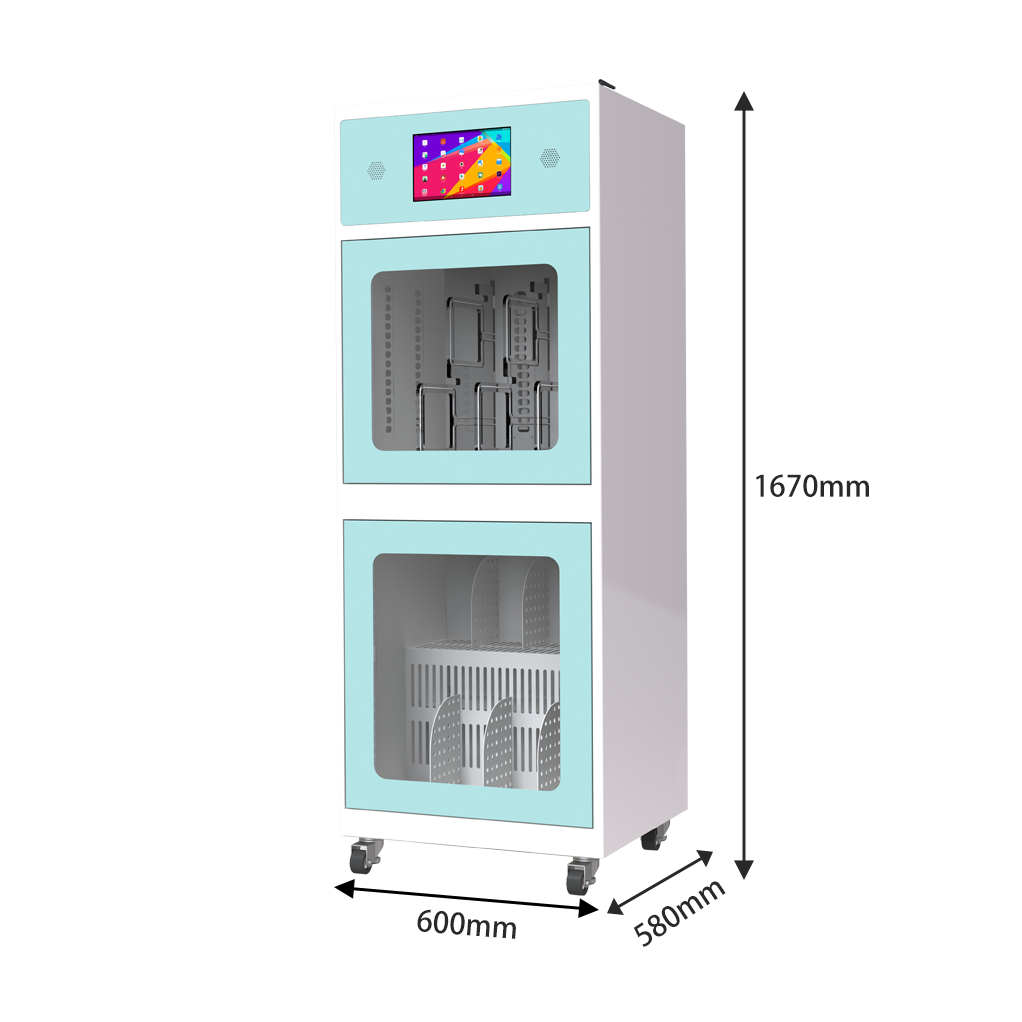 智能消毒柜是一款紫外线 + 臭氧双重消菌的智能化消毒设备,配备 10.1 寸触摸显示屏,采用 4 组增加型紫外线灯 + 臭氧(可选配 11 组),上层紫外消毒区 1 次可消毒图书 6 本,下层可以批量消毒。产品可杀灭各种真菌、霉菌、肝炎病毒和一些危害档案图书安全的微生物 , 并可以除虫,提高图书、档案的保存时间和保存安全,针对纸质品全面杀菌消毒 , 如 : 绘本 , 课本,图书等。本产品广泛应用于图书馆、档案管理、可用于读者借阅前对图书进行全面消杀,也可用于馆员对图书批量消杀。