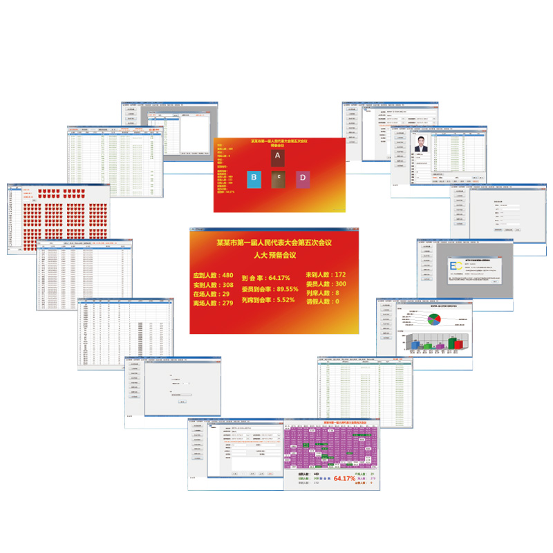 可不断根据刷卡情况更新数据,在多个屏幕上同步显示统计签到情况。可选择采用计算机显示器、电视机及电视墙来实时监控报到情况,使报到情况一目了然,方便了代表,也提高了透明度;