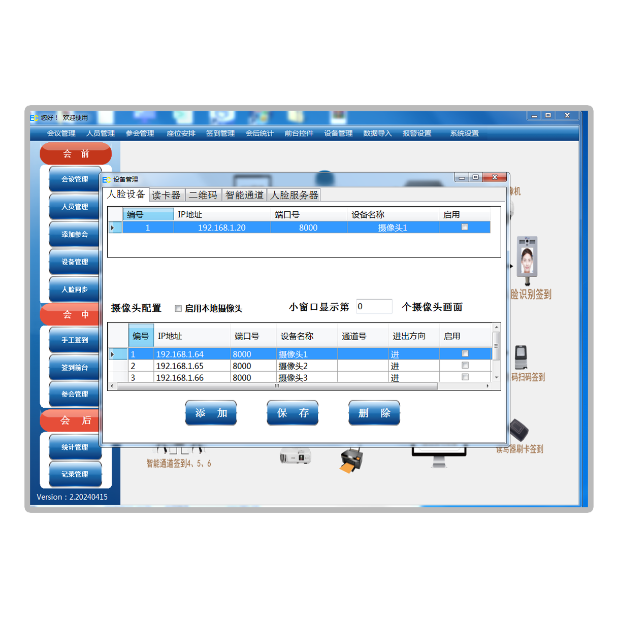 严进宽出,统计参会停留时长,实时投屏参会数据,显示未到人员,人脸识别+RFID感应识别双重认证,防止代打开代签到,可云端部署或者内网部署服务器,各客户端实时共享更新数据;可设置多个分会场按地点时间进行分会议场次切换;增加参会人员各会议进出停留时间累计统计功能;设置同步第三方实时签到数据上传下载功能;选配联网版还是下载数据切换本地版功能,本地版可实时上传下载数据;增加人脸识别签到功能,增加RFID+人脸识别双重认证签到功能;增加签到认证成功联动外部设备闸机开闸放行功能;完善各种签到状态不同声光报警提示功能可选配;
